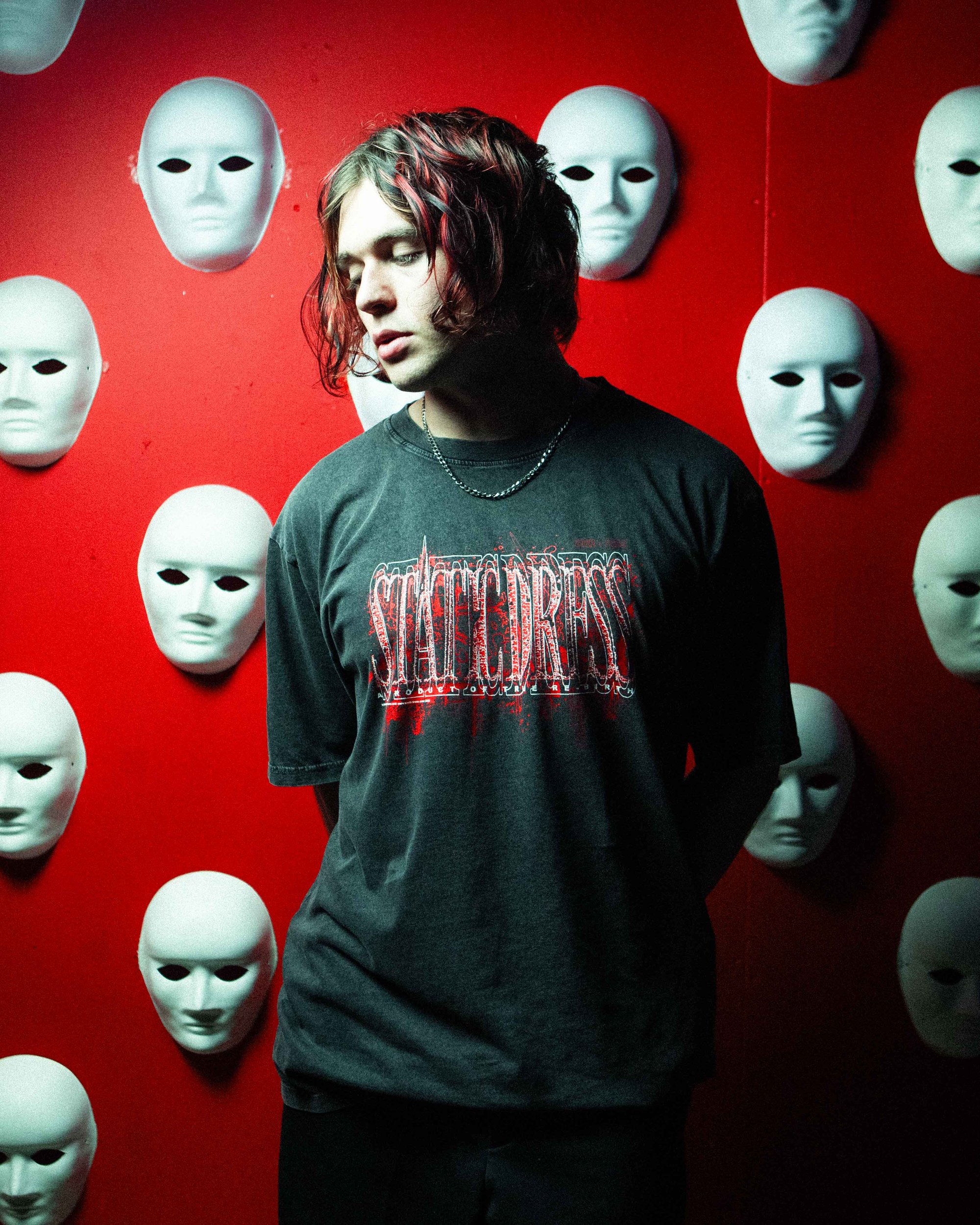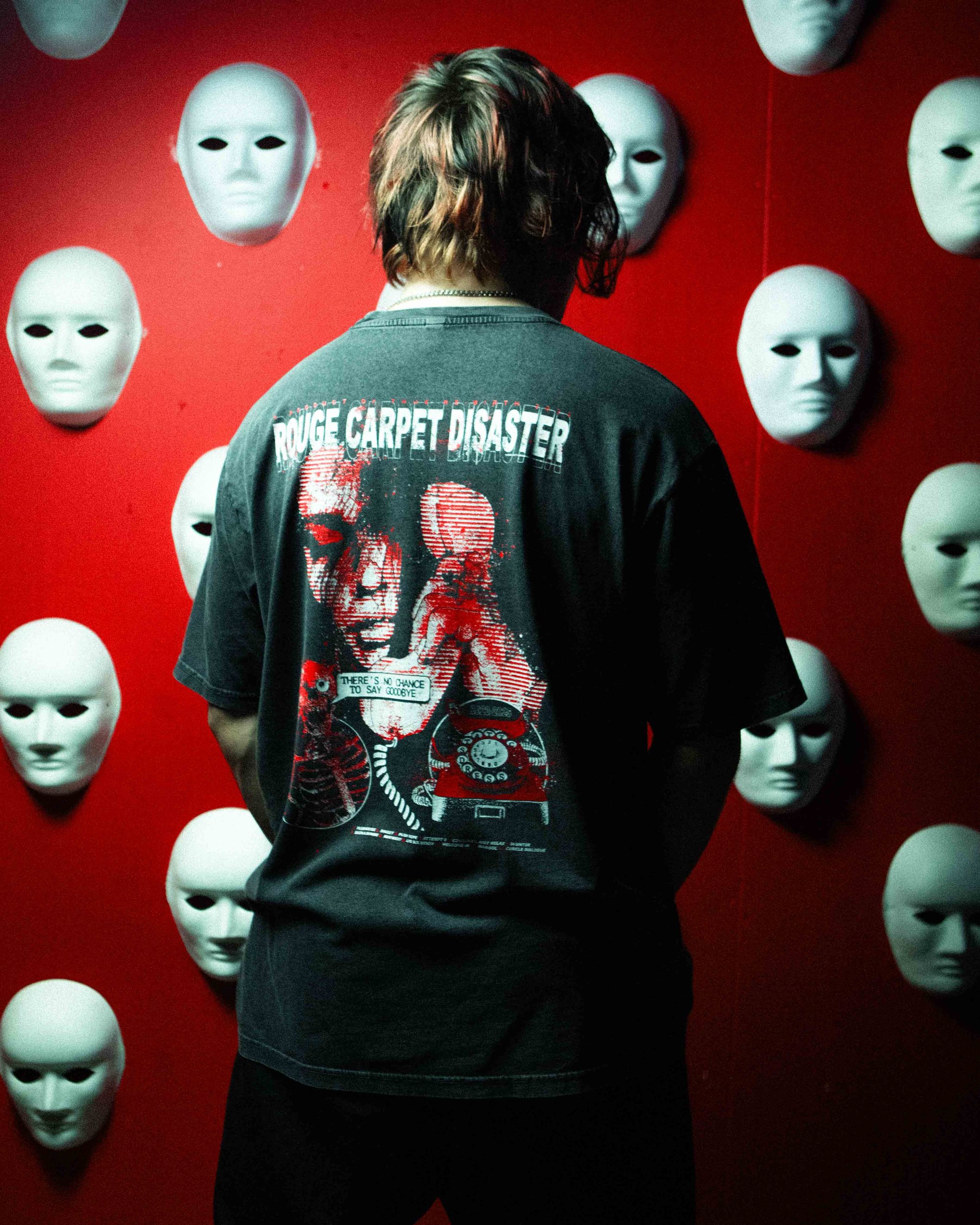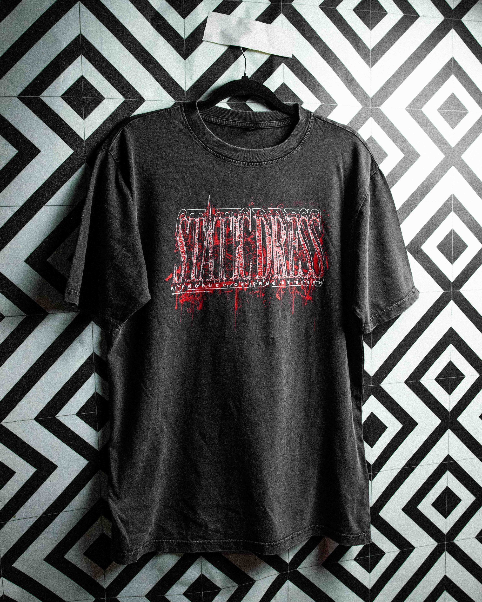 Dual coloured screen print front and back design, printed on continental oversized vintage pale black, destressed effect, 100% cotton.